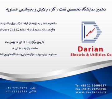 دهمین نمایشگاه تخصصی نفت ، گاز ،پالایش و پتروشیمی عسلویهDarian Co1397/11/14دهمین نمایشگاه تخصصی نفت ، گاز ،پالایش و پتروشیمی عسلویه ... ادامه مطلب